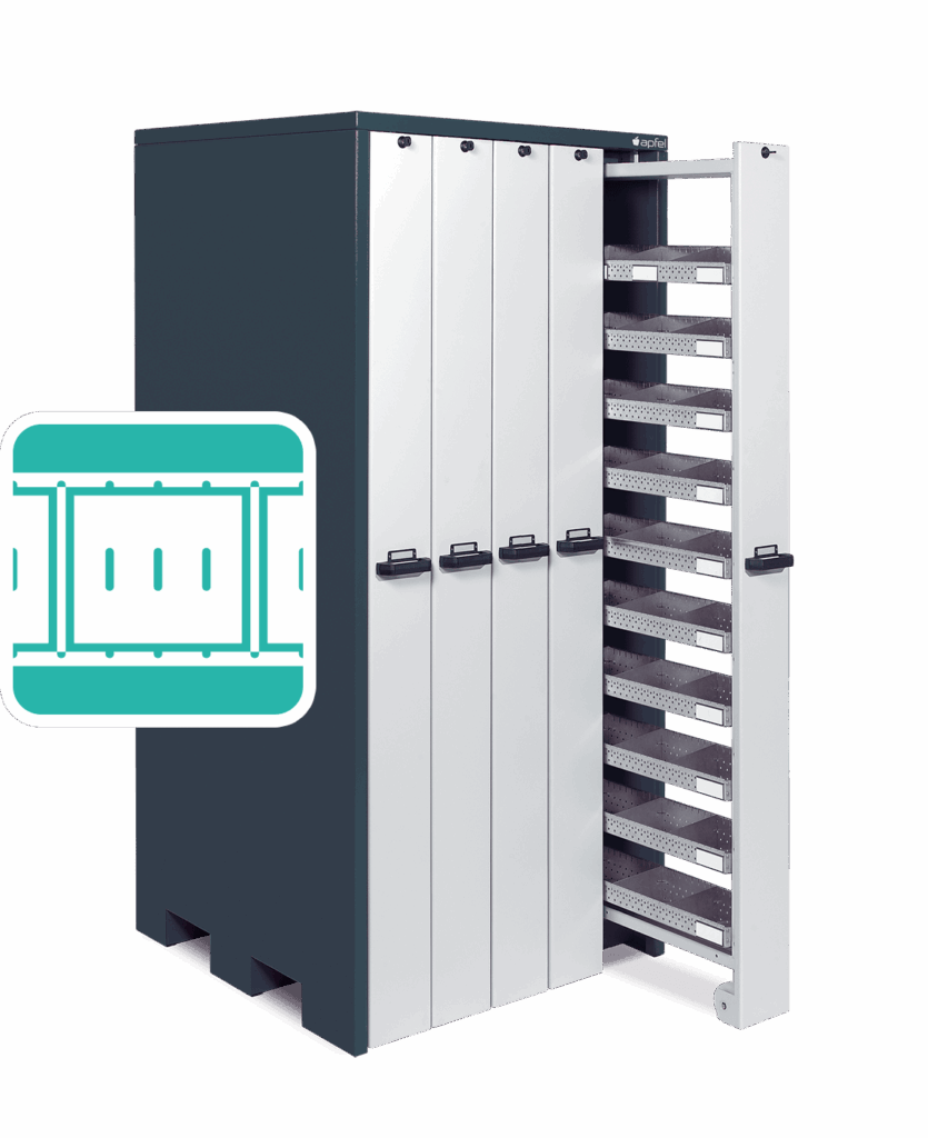 - Individuell konfigurierbar mit Tablarbreiten von 1.250 – 4.050 mm und Tablartiefen von 610 – 1.270 mm