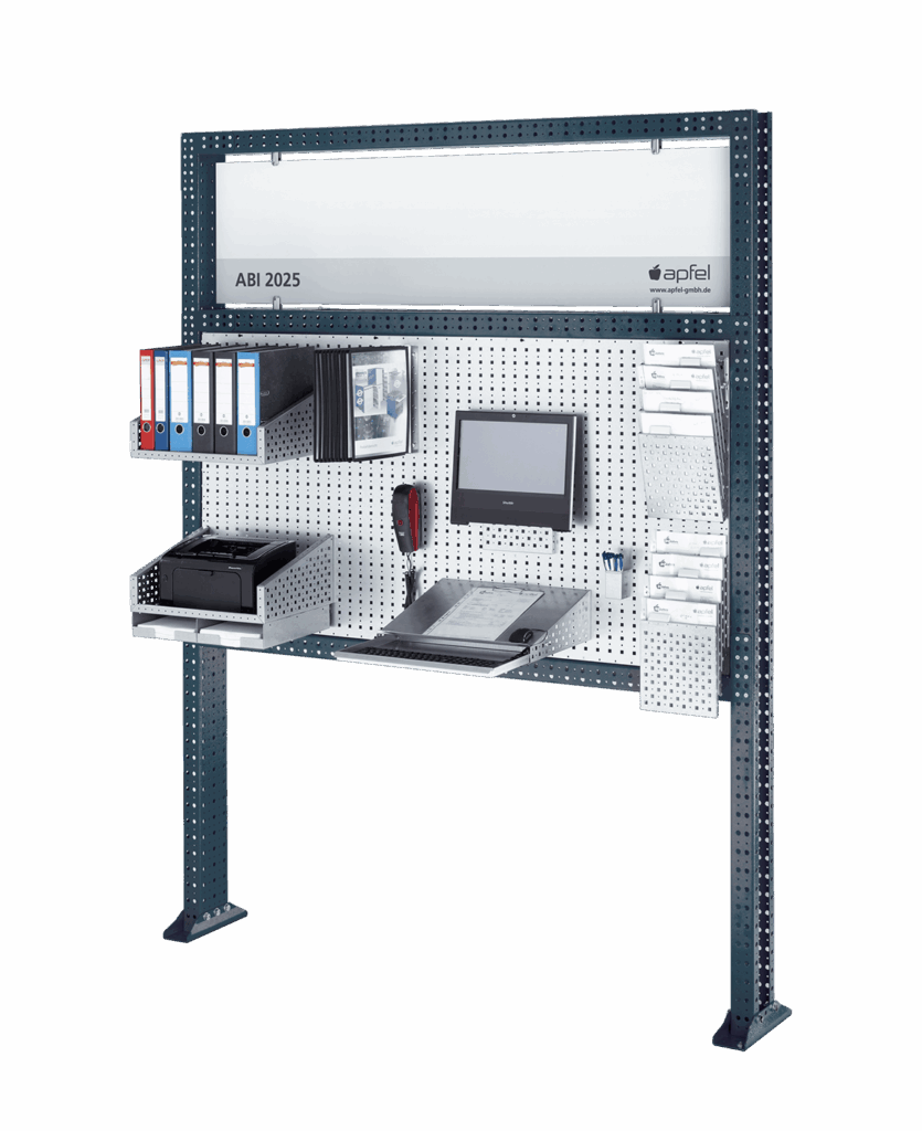 - Für maximale Flexibilität sind alle Bauteile aus Lochblech (10 x 10 mm Quadrat- und 5 mm Rundlochung) gefertigt, an dem sich Zubehör wie Haken, Bügel, Halter und Verschraubungen anbringen lassen