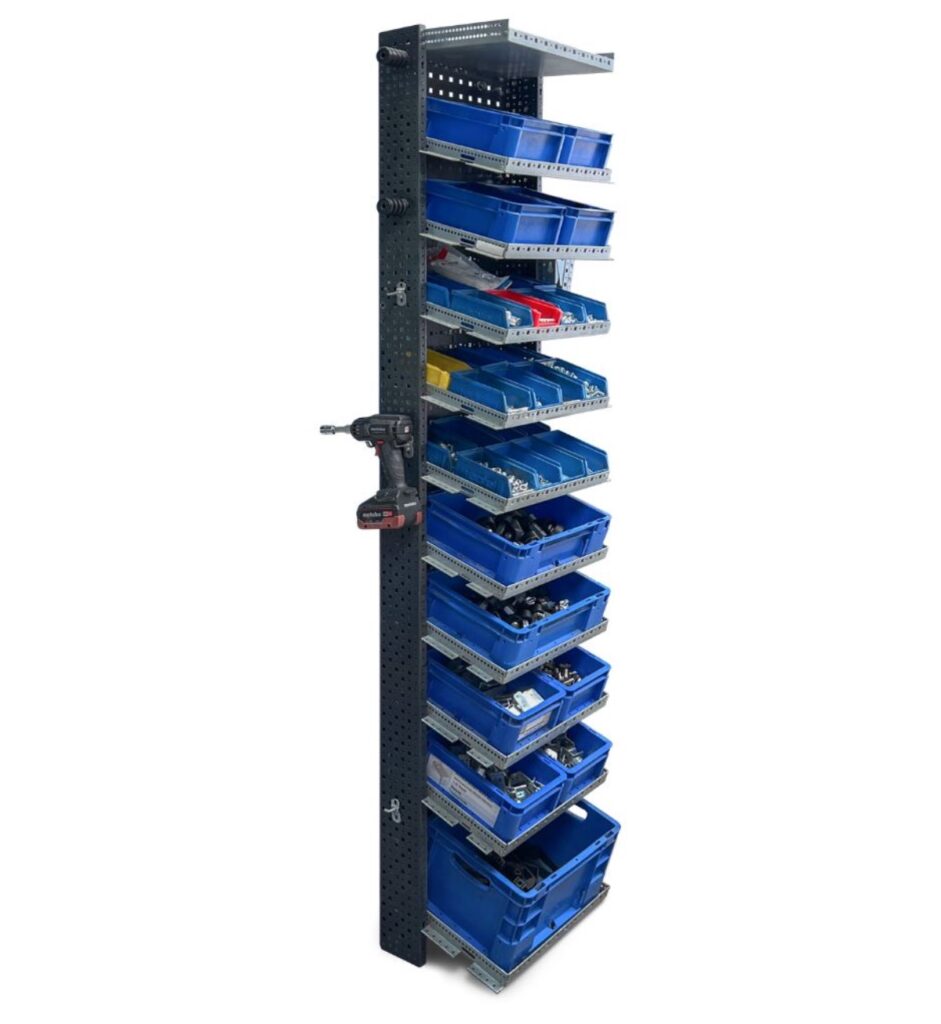 - Speziell konstruierte Fachböden in unterschiedlichen Breiten bieten einen passgenauen und sicheren Sitz für gängige Lagerkästen und Euronormbehälter