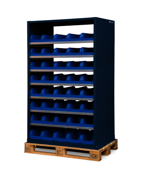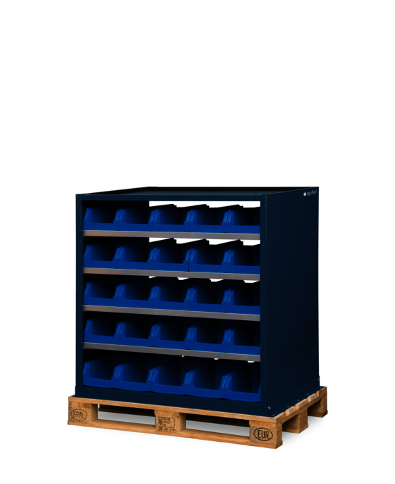 - Komplett montiert inklusive vier Fachböden, 50 Lagerkästen (Nr. 13) und Europlatte