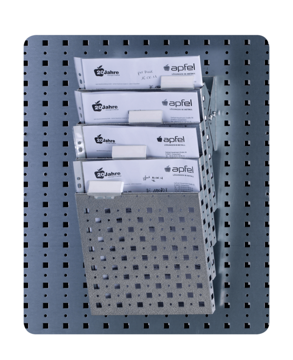 - Für maximale Flexibilität sind alle Bauteile aus Lochblech (10 x 10 mm Quadrat- und 5 mm Rundlochung) gefertigt, an dem sich Zubehör wie Haken, Bügel, Halter und Verschraubungen anbringen lassen