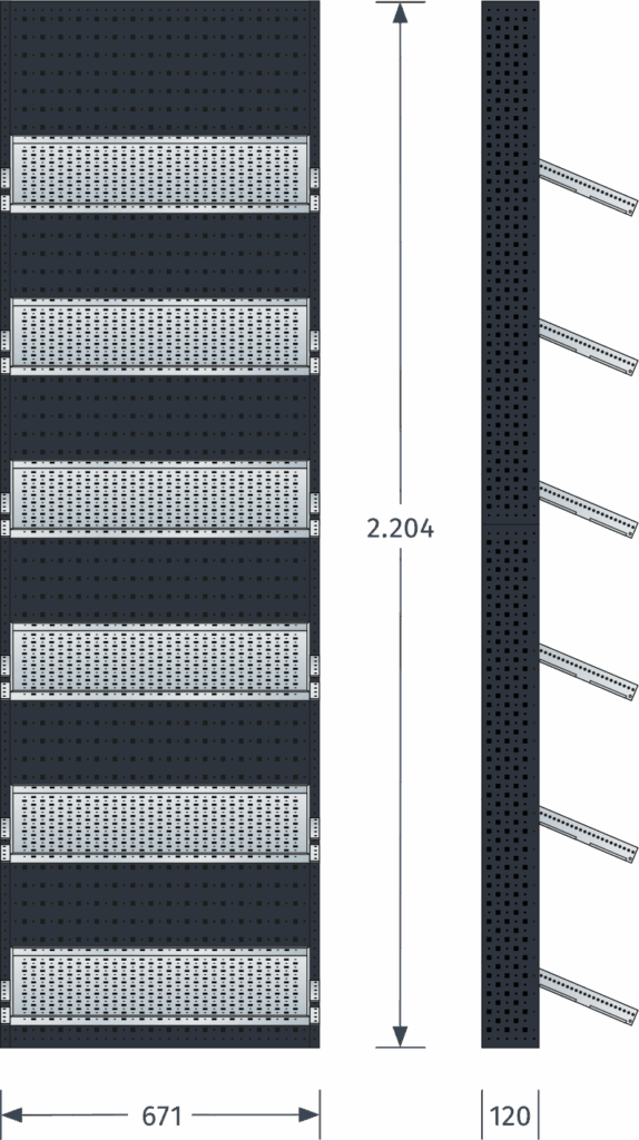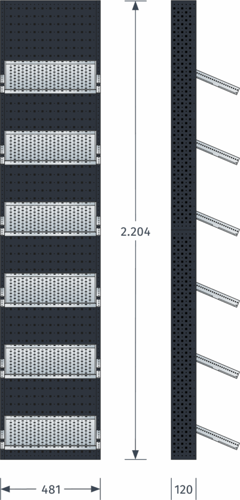 - Komplett aus Lochblech mit zusätzlicher Rundlochung für die individuelle Ergänzung von Zubehör mit Haken oder Schrauben