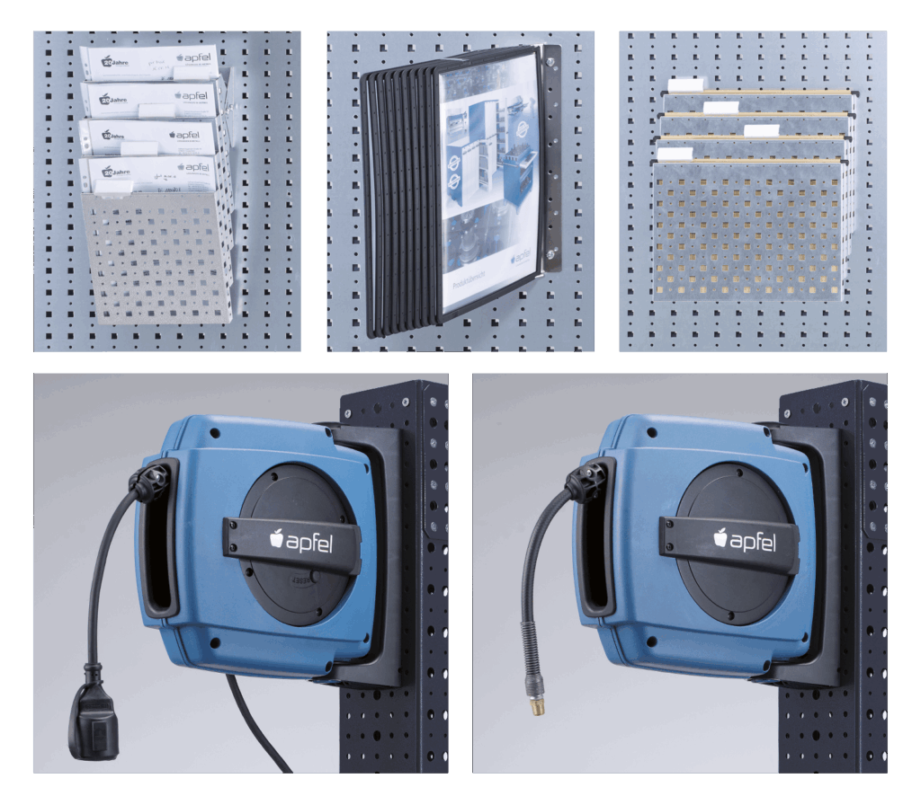 - Für maximale Flexibilität sind alle Bauteile aus Lochblech (10 x 10 mm Quadrat- und 5 mm Rundlochung) gefertigt, an dem sich Zubehör wie Haken, Bügel, Halter und Verschraubungen anbringen lassen