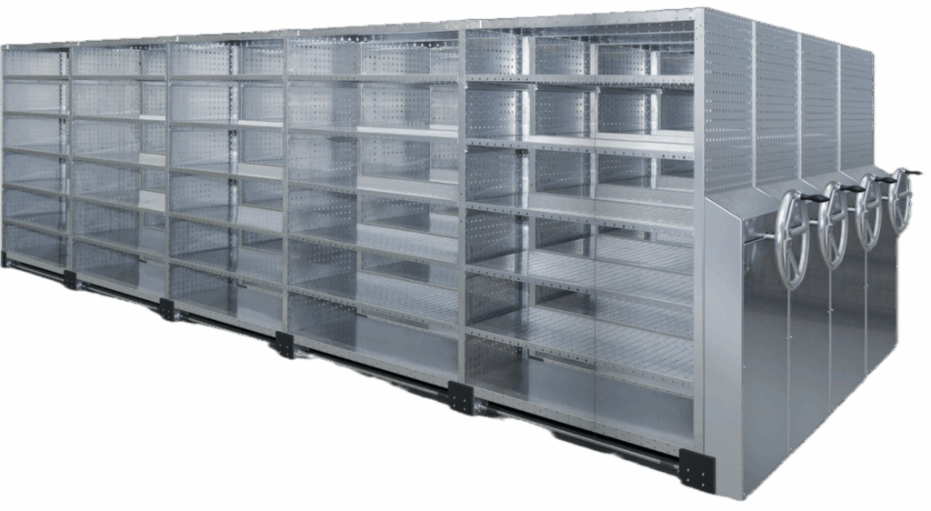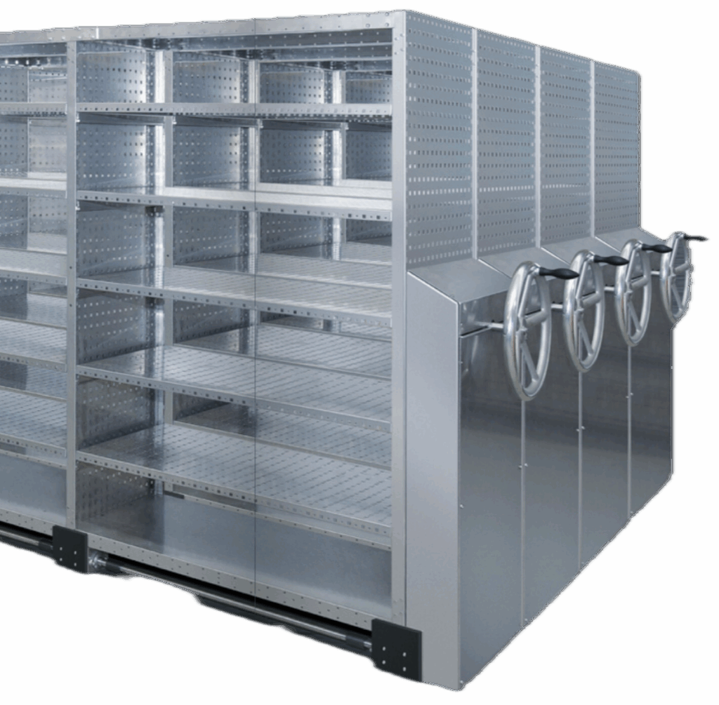 Das Verschiebe- bzw. Rollregal ist eine durchdachte Lösung für Lagerhallen und Archive. Sie eignen sich ebenfalls ideal für hygienekritischen Räumen (wie in pharmazeutischen oder lebensmittelverarbeitenden Betriebe) oder für energieintensive Lagerbereiche (wie in Tiefkühlräumen).