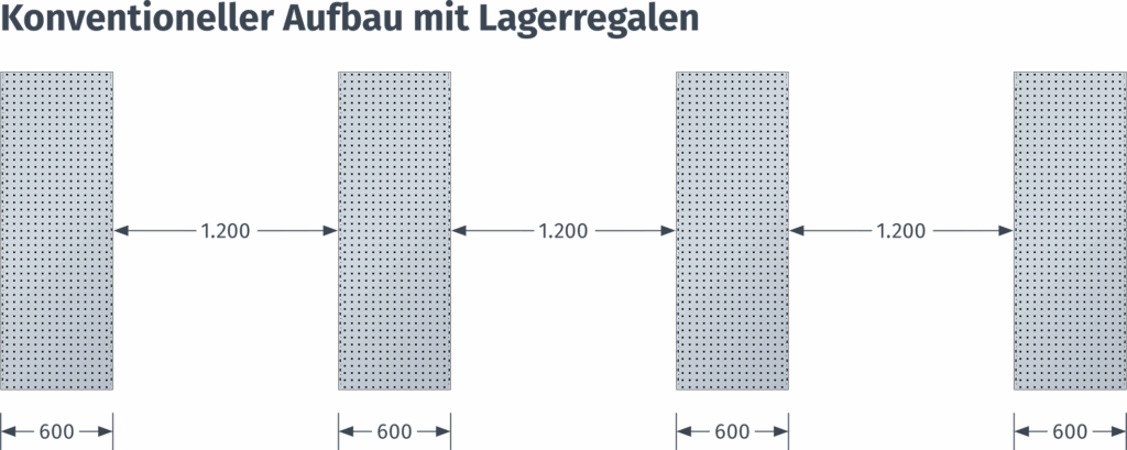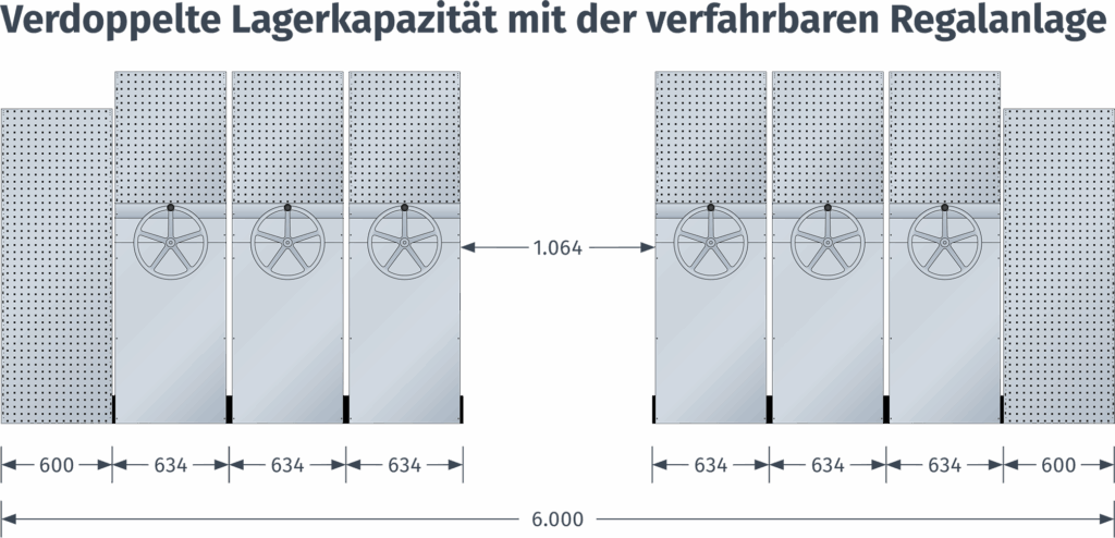 Bereits ab etwa 6 Meter Raumbreite verdoppelt sich die Lagerfläche im Vergleich zu klassischen Regalzeilen. Mit jedem weiteren Meter steigt die zusätzlich gewonnene Kapazität – ohne bauliche Erweiterung, höhere Raumkosten oder aufwendige Installation