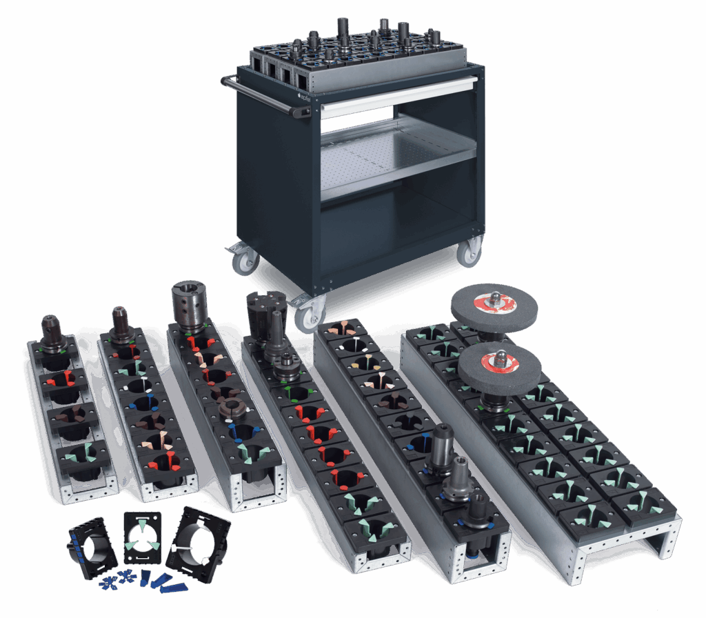 Wenn jede Rüstkassette oder jedes Werkzeug einzeln vom Rüstplatz zur Maschine transportiert werden muss, geht wertvolle Zeit verloren. Maschinenstillstände durch Wegezeiten und Rüstfehler verursachen hohe Kosten.