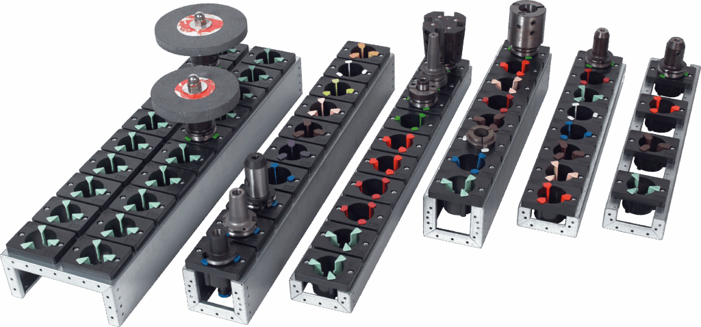 - Spezielle Werkzeughalter zum passgenauen Lagern und Bereitstellen von sämtlichen Bohr-, Dreh- und Fräswerkzeugen